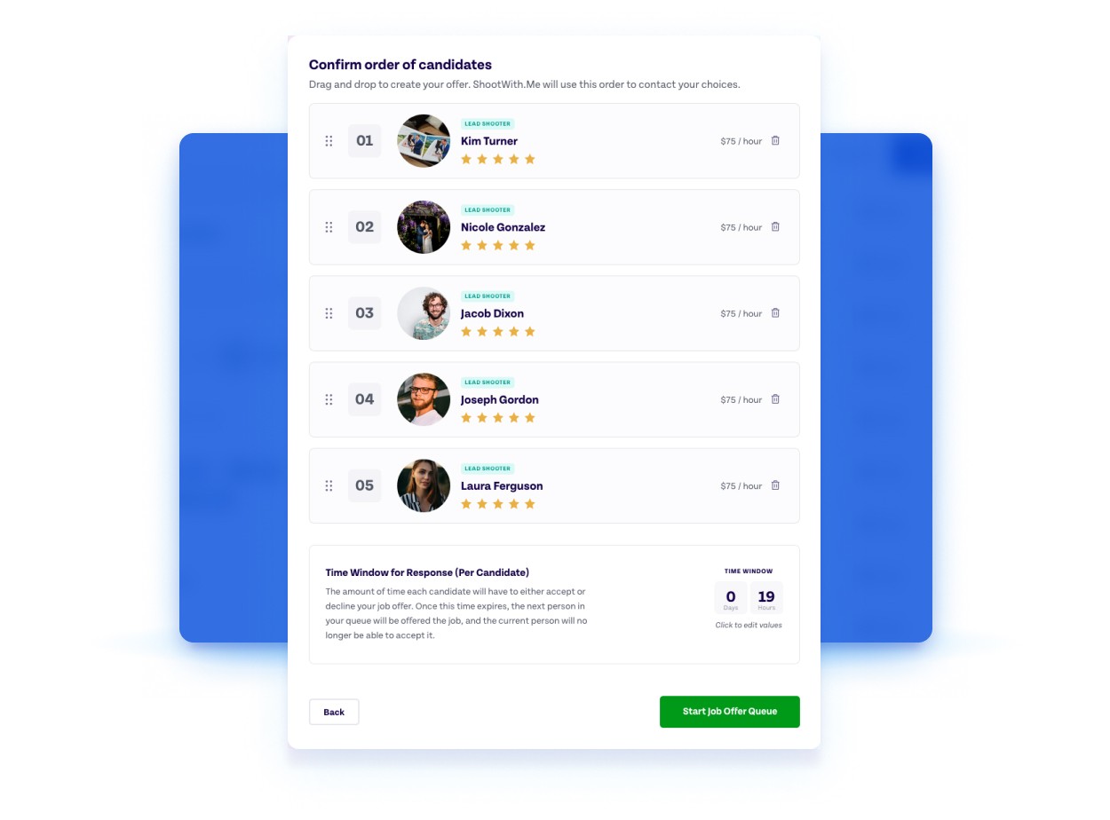 Our queue feature allows you to add and order the talent you've selected and offer the top person in the queue the job. If they accept the job, then great! But if they don't, our system will reach out to the next person on the queue automatically. No need to manually go in and message individuals each time.