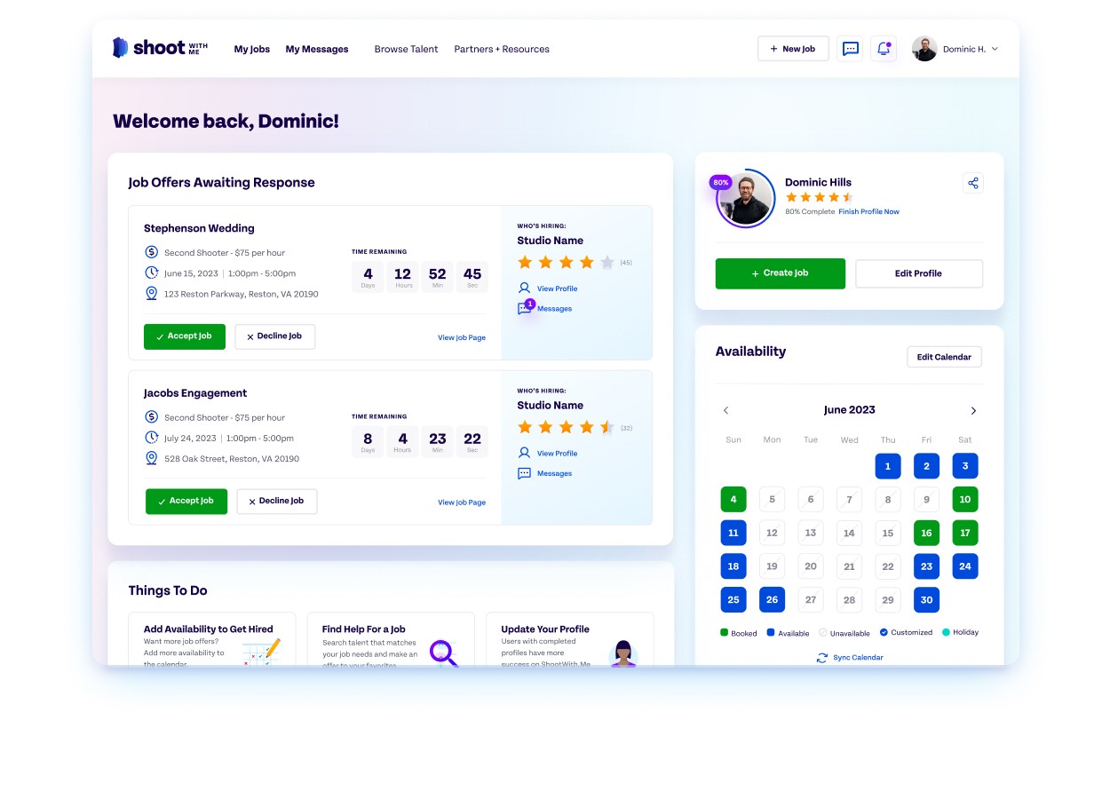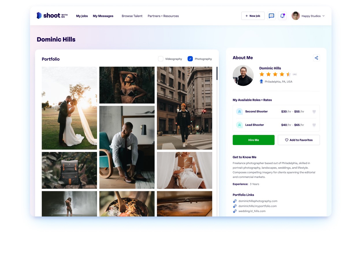 ShootWith.Me simplifies and streamlines the way studios find and hire assistants, second shooters, and associates. Never again will you have to wait hours or days to get help lined up for an upcoming shoot. With ShootWith.Me's robust features, finding tailor fit and reliable talent is only a few clicks away.