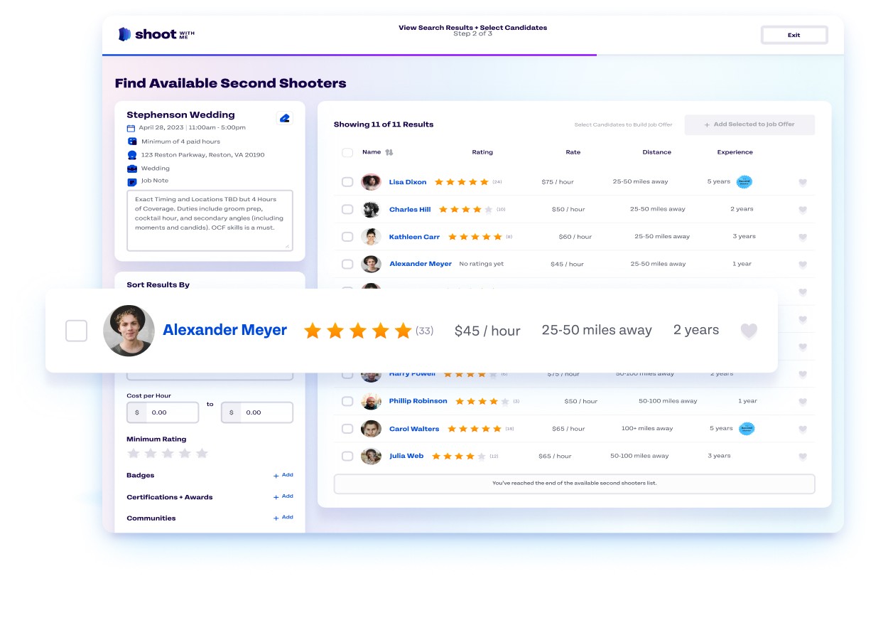 Search for help based on your event's location, availability, experience, gear, reviews, rate, and more. Once you see the list of everyone who aligns with your needs, assemble a list of your top options.