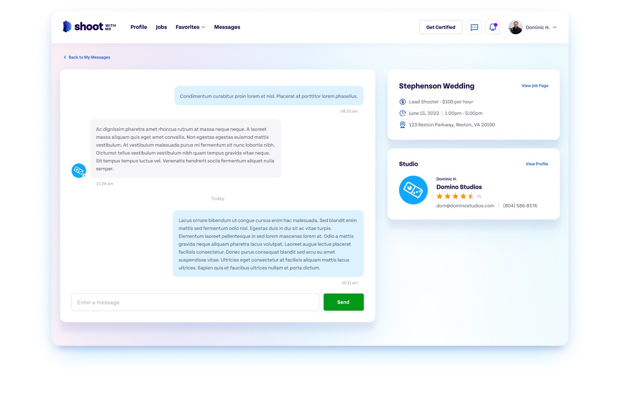 Whether you're in your studio, out on a job, or just chilling at home, stay up to date with all of your conversations within ShootWith.Me by utilizing our native messaging tool, emails and SMS: All syncing with one another to ensure you never miss a detail.