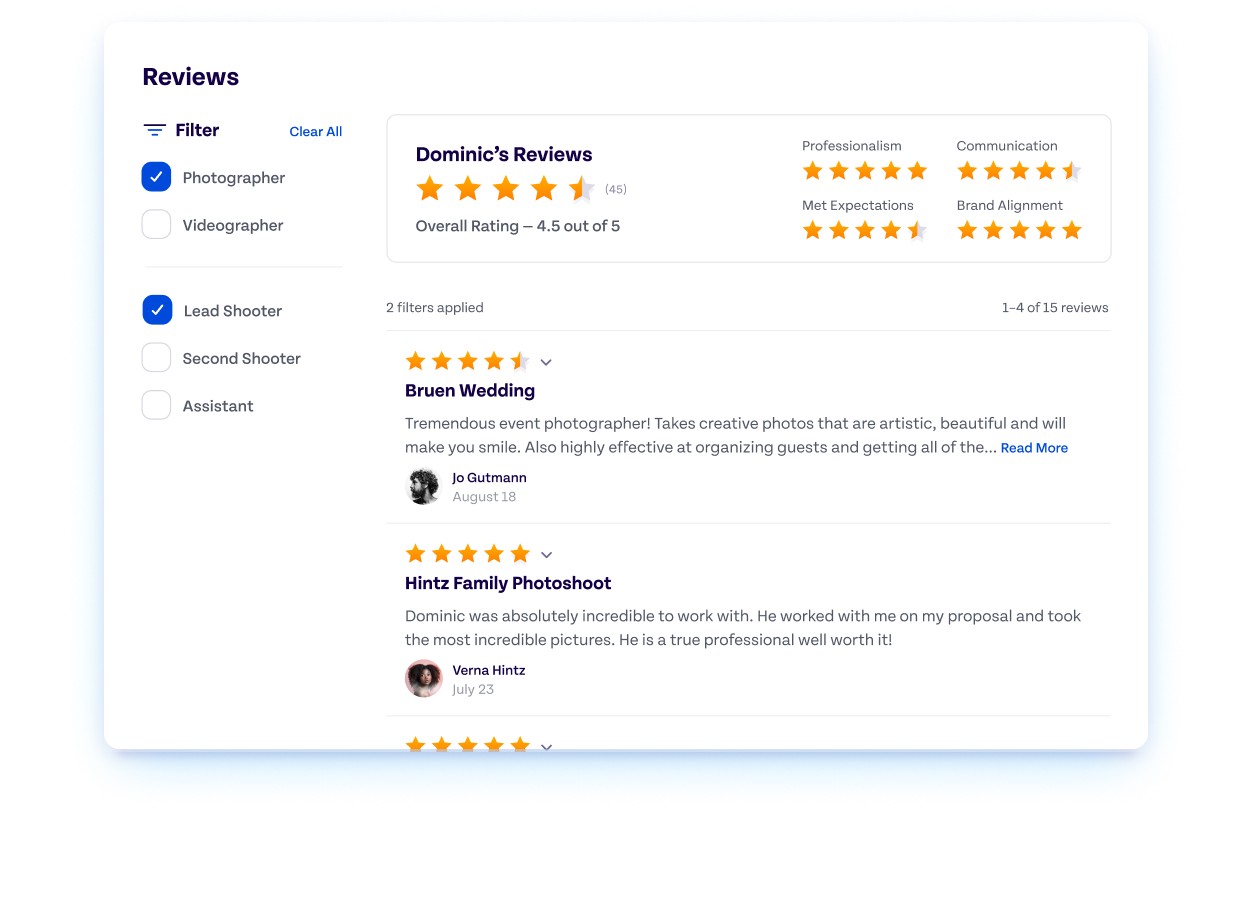 When performing a search for an upcoming job, you can filter your results based on the date of your shoot, the location, rate you want to pay, gear, experience, reviews and more.